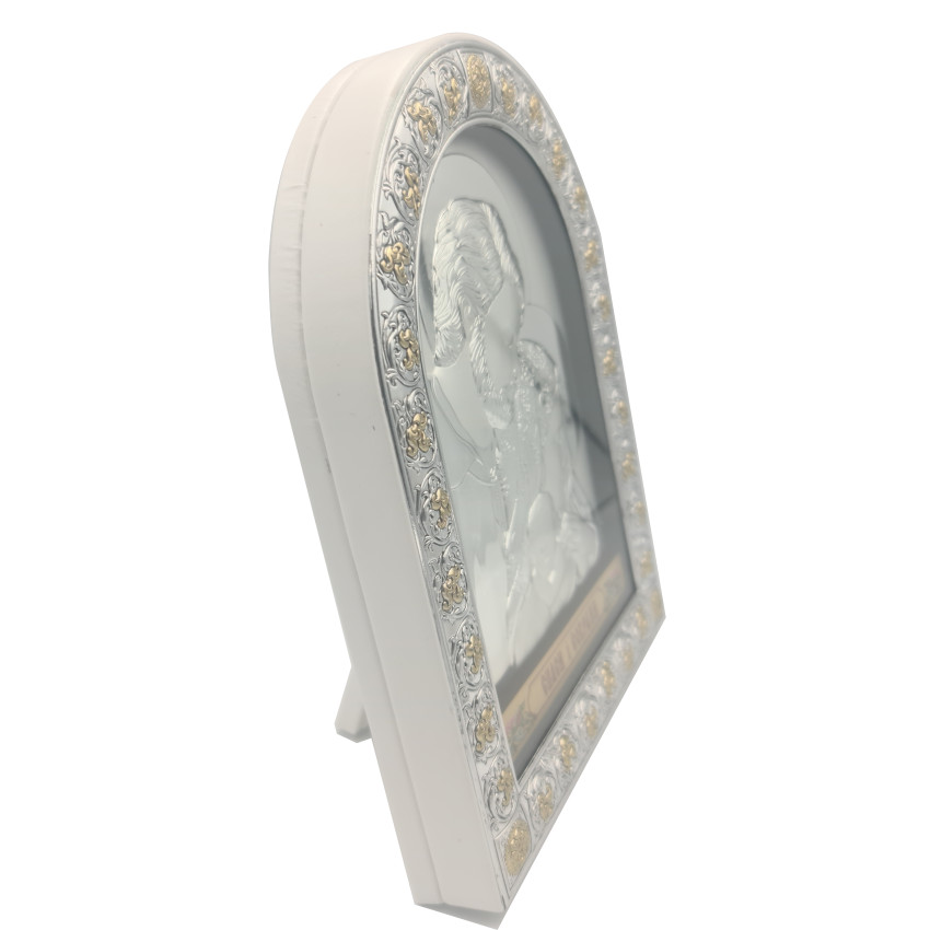 Срібна Ікона Свята Сім'я 21,5х16,5см в італійському стилі арочної форми під склом в білій шкірі EPZ4-188AG/S