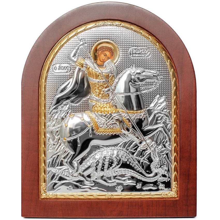 Срібна Ікона Святого Юрія (Георгія) Змієборця 20х25см арочної форми на дереві з рамкою EP5-010XAG/P