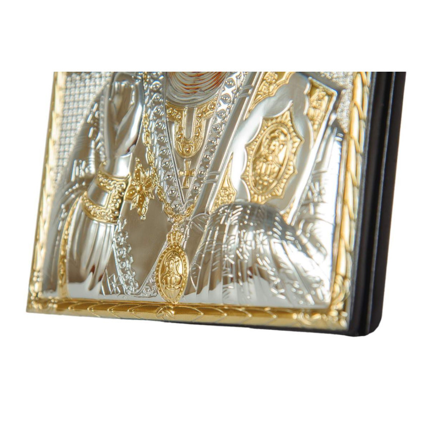 Образ має прямокутну форму.Оклад виробу виготовлений із комбінованого листа металу miro-silvero – верхня частина якого ламінована сріблом 999°: в окремих місцях композиція вдало прикрашена сусальним золотом, що придає їй більш контрастного вигляду. За допомогою сучасних методів обробки дорогоцінних металів та новаційного устаткування, виробнику вдалося досягнути найвищої якості деталізованого зображення на сріблі - всі елементи орнаменту композиції ікони чітко вирізьблені та яскраво проглядаються до найменших дрібниць. Обличчя Святих – відкрите та прописане методом шовкографії на лляному полотні натуральними фарбами «темпера». Зовнішній шар дорогоцінного металу ікони покритий спеціальним захисним лаком, що уберігає срібло від потемніння та старіння, захищаючи його від зовнішніх подразників таких як пил та сонячні промені – образ зберігатиме свій первозданний вигляд багато років.Закріплений оклад на дерев'яній основі коричневого кольору. (МДФ покритий шпоном горіха)Ікона має відкидну ніжку-підставку та отвір для зручного вертикального розміщення на стіні. Даний виріб чудо буде підійде до інтер'єру спальної кімнати, кухні, вітальні чи дитячої кімнати.Образ виготовлений в грецькому стилі іконографії з дотриманням всіх канонів давньовізантійського іконопису.Переваги: Багатошаровий матеріал окладу miro-silvero;Захищений від потемніння срібний оклад;Гармонійне поєднання срібла з золотом;Чіткий деталізований рельєфний узор;Європейське виробництво;Упакування:Виріб має оригінальне фірмове упакування від виробника - ікона надійно упакована в якісній картонній коробочці з логотипом компанії та м'який мішечок; дане упаковування гарантує, що виріб надійде Вам цілим та неушкодженим, а також в такому вигляді образу можна представити на подарунок близькій людині.Виробник: Silver Axion;Модельний ряд: Afon Silvero;Країна виробник: Греція;Купуючи в інтернет-магазині Silvericons срібний образ - Ви завжди будете впевненими у придбанні автентичного, якісного та оригінального виробу! Всі грецькі ікони мають Сертифікат Якості від виробника на тильній стороні, який засвідчує, що даний образ виготовлено на фабриці Silver Axion, а також вказує на модельну серію - Afon Silvero. Сертифікат надає Вам безстрокову Гарантію на дану ікону...