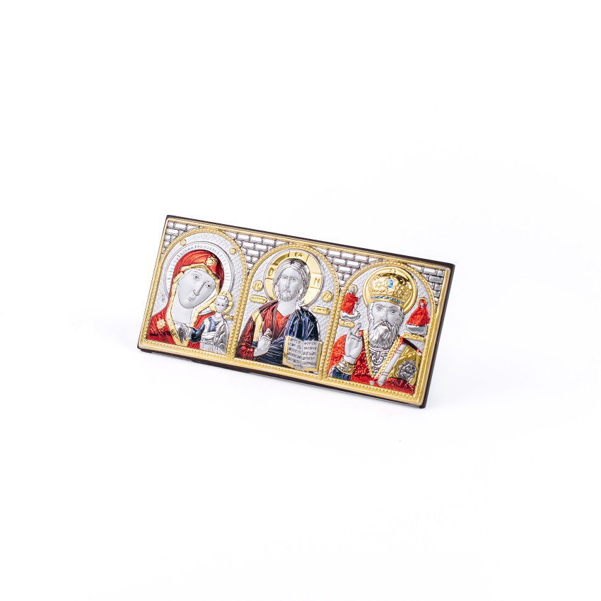 Образ має аркову форму без рамки.Оклад виробу виготовлений із комбінованого багатошарового листа металу miro-silvero – верхня частина якого ламінована сріблом 999°, та в деяких місцях прикрашена сусальним золотом. Обличчя Святих – відкрите, воно прописане методом шовкографії на лляному полотні натуральними фарбами «темпера». Зовнішній шар дорогоцінного металу ікони покритий спеціальним захисним лаком, що уберігає срібло від потемніння та старіння, захищаючи його від зовнішніх подразників таких як пил та сонячні промені – образ зберігатиме свій первозданний вигляд багато років.Основа, кіот ікони, виготовлена з тонкого пластину коричневого кольору.Ікона має відкидну ніжку-підставку для зручного вертикального розміщення. Даний виріб чудо буде підійде до інтер'єру спальної кімнати, кухні, вітальні чи дитячої кімнати.Образ виготовлений в грецькому стилі іконографії з дотриманням всіх канонів давньовізантійського іконопису.Переваги: Багатошаровий матеріал окладу miro-silvero;Захищений від потемніння срібний оклад;Гармонійне поєднання срібла з золотом;Компактна форма кіота;Чіткий рельєфний узор;Упакування:Виріб має оригінальне фірмове упакування від виробника - ікона надійно упакована в якісній картонній коробочці з логотипом компанії; дане упаковування гарантує, що виріб надійде Вам цілим та неушкодженим, а також в такому вигляді образу можна представити на подарунок близькій людині.Виробник: Silver Axion;Модельний ряд: Afon Silvero;Країна виробник: Греція;Купуючи в інтернет-магазині Silvericons срібний образ - Ви завжди будете впевненими у придбанні автентичного, якісного та оригінального виробу! На кожну придбану срібну ікону на пластиковому кіоті діє Гарантія на 3 роки!..