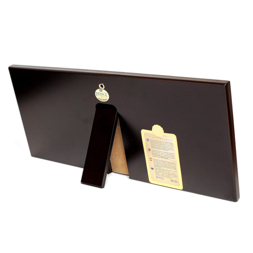 Оклад покрытый кольоровою эмалью. Закреплен на деревянной основе ( МДФ покрыт шпоном ореха )