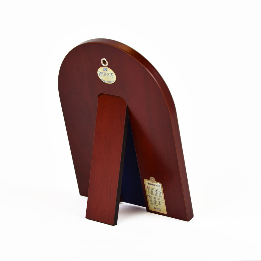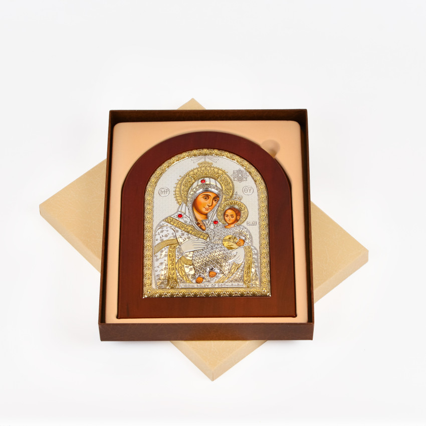 Закріплений оклад в дерев'яній основі (кіоті) аркової форми, яка виготовлена із МДФ покритого шпоном дерева. Ззаду ікони є відкидна ніжна та отвір для кріплення на стіні.