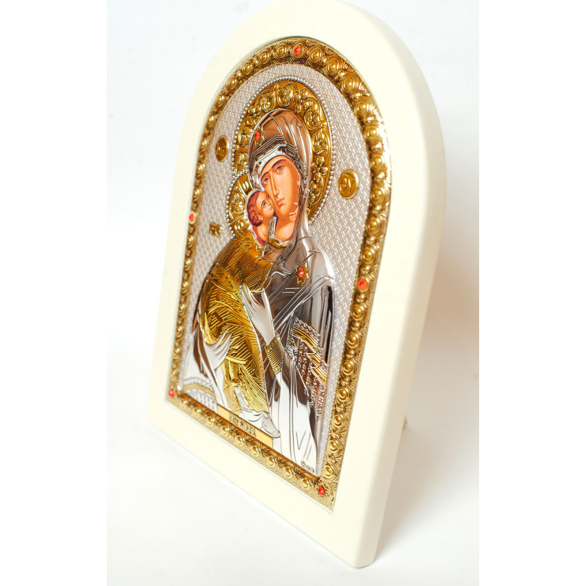 Володимирська Божа Матір, срібна ікона на білому дереві 15х21 см