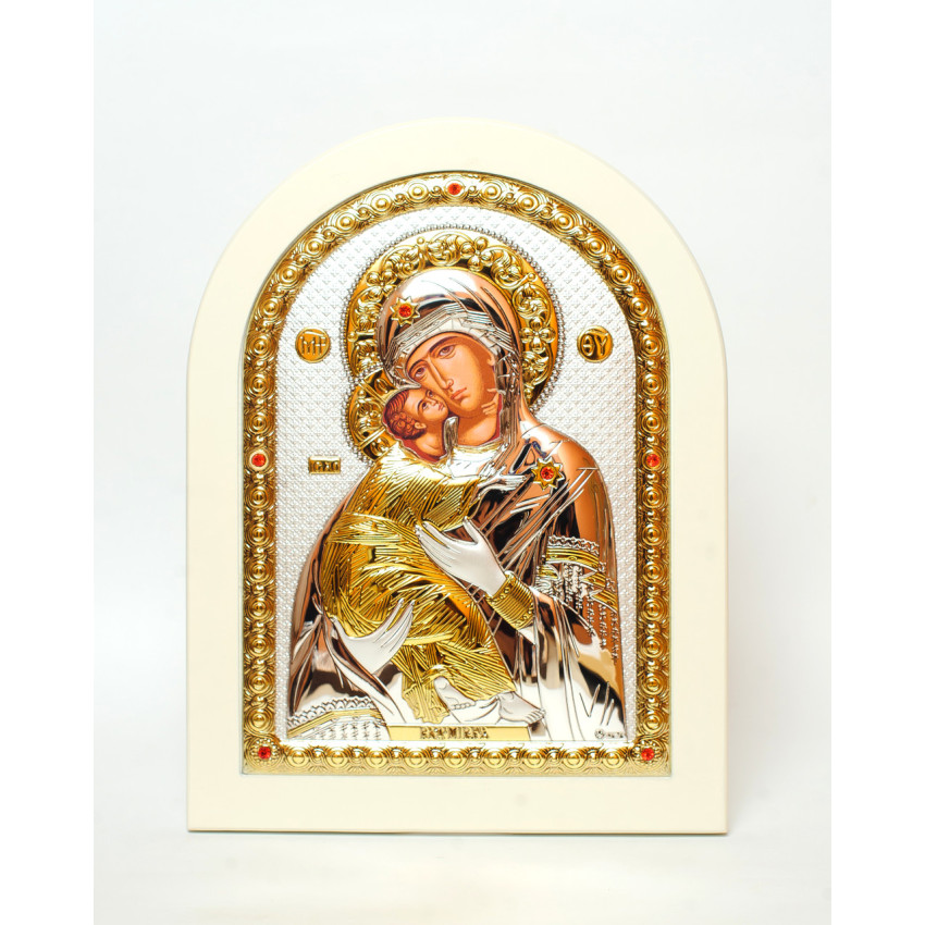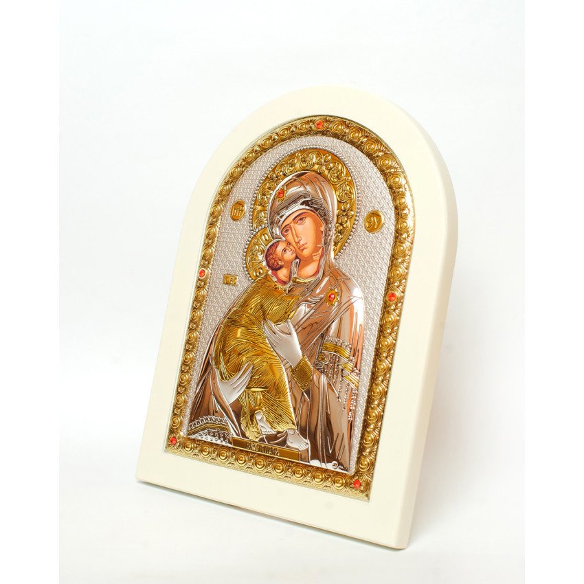 Володимирська Божа Матір, срібна ікона на білому дереві 20х25 см