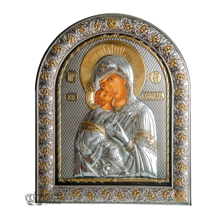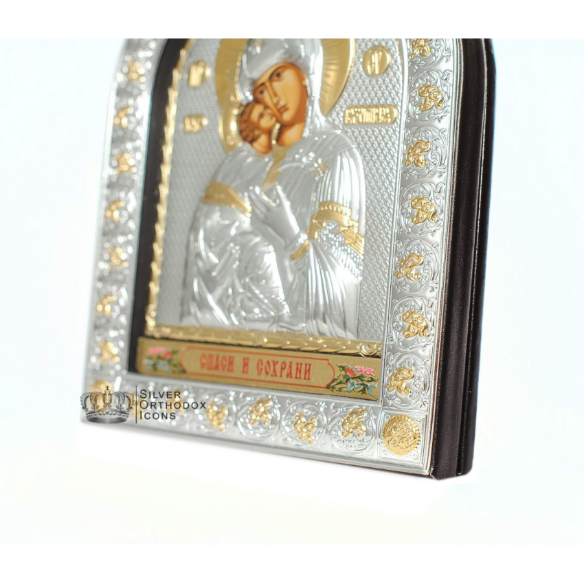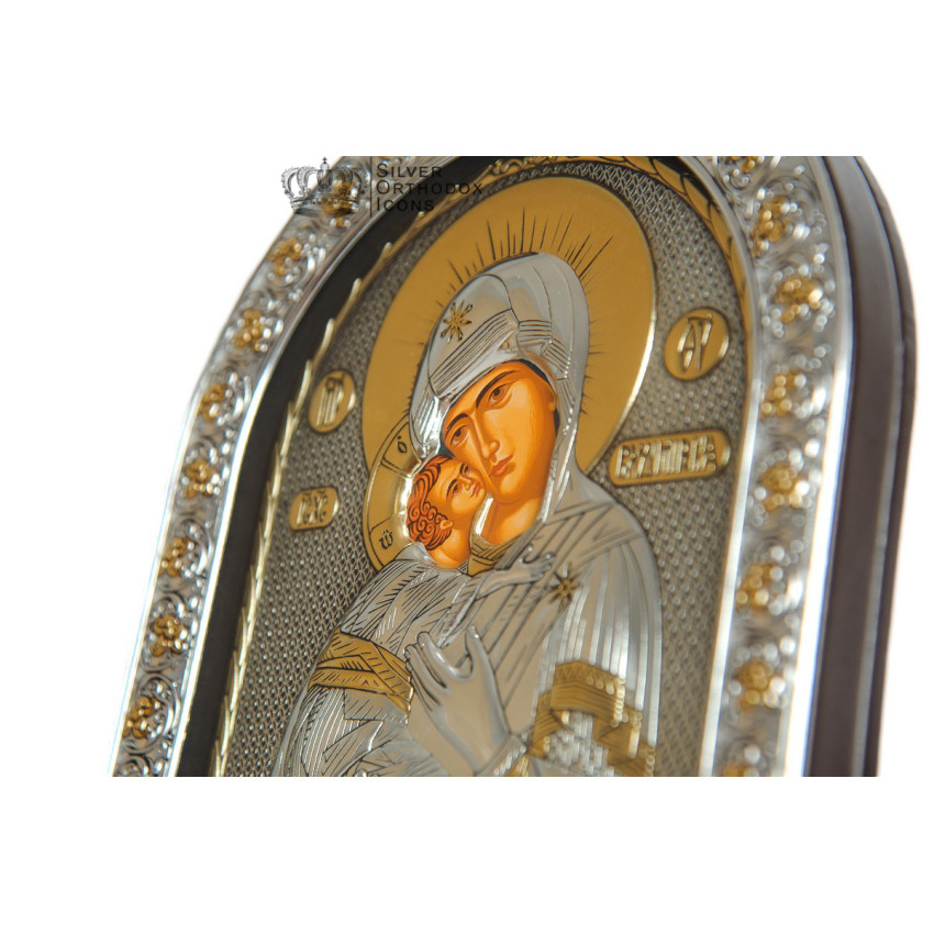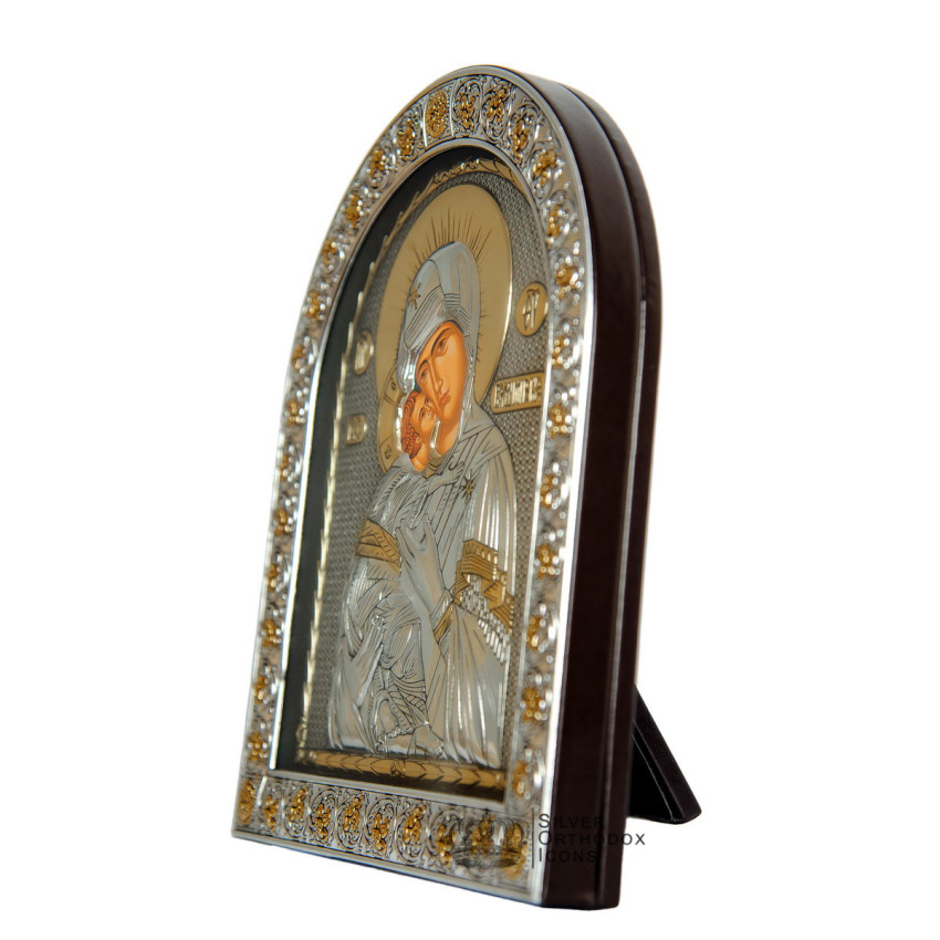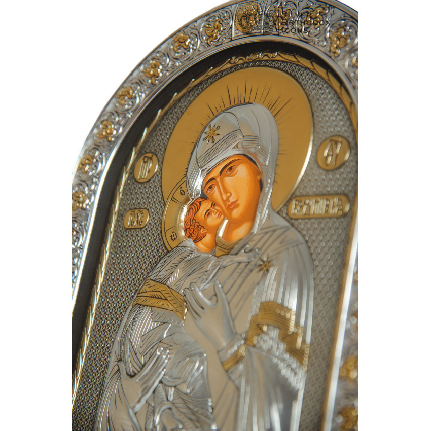 Представленная Иконы "Владимерская Божья Матерь" сделана из серебряного оклада 925 пробы и позолоты , лик прописанный натуральными красками "темпера" методом шелкографии на натуральному холсте. Икона закрыта стеклом з серебряной рамкой украшеной орнаментом в виде цветов. Ссади икона покрыта тонкой кожой , есть откидная ножка. Сделана икона по всем православным канонам в старом византийском стиле, на лучшей иконописной фабрике Silver Axion (Греция)
