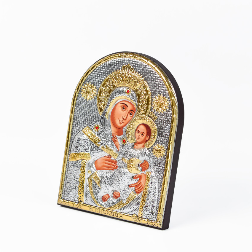 Оклад виробу виготовлений із комбінованого листа металу miro-silvero – верхня частина якого ламінована сріблом 999°: в окремих місцях композиція вдало прикрашена сусальним золотом, що придає їй більш контрастного вигляду. За допомогою сучасних методів обробки дорогоцінних металів та новаційного устаткування, виробнику вдалося досягнути найвищої якості деталізованого зображення на сріблі - всі елементи орнаменту композиції ікони чітко вирізьблені та яскраво проглядаються до найменших дрібниць. Обличчя Святих – відкрите та прописане методом шовкографії на лляному полотні натуральними фарбами «темпера». Зовнішній шар дорогоцінного металу ікони покритий спеціальним захисним лаком, що уберігає срібло від потемніння та старіння, захищаючи його від зовнішніх подразників таких як пил та сонячні промені – образ зберігатиме свій первозданний вигляд багато років.