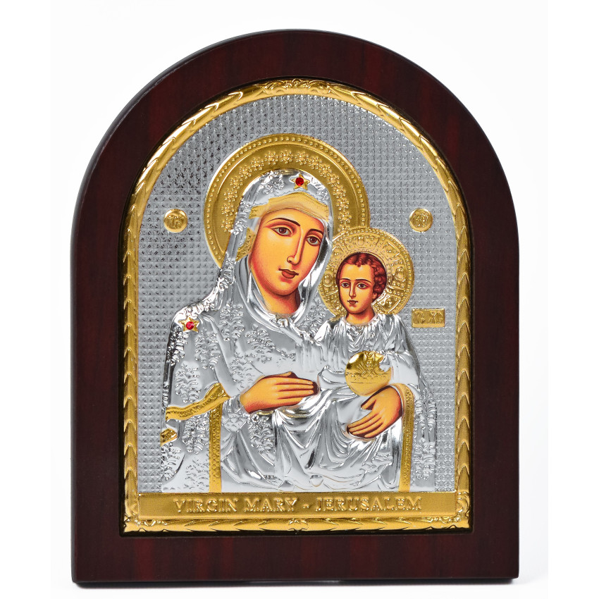 Срібна Ікона Єрусалимська Божа Матір аркової форми на дереві 8,1х9,7см